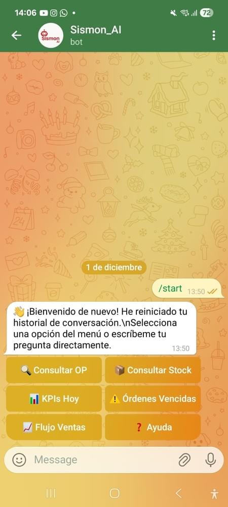 SISMON AI es un asistente conversacional diseñado para centralizar y automatizar las consultas operativas de producción, inventario y ventas, directamente desde Telegram, integrándose al ERP iDempiere y generando reportes PDF, gráficos automáticos y alertas inteligentes en tiempo real.